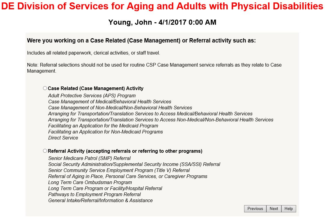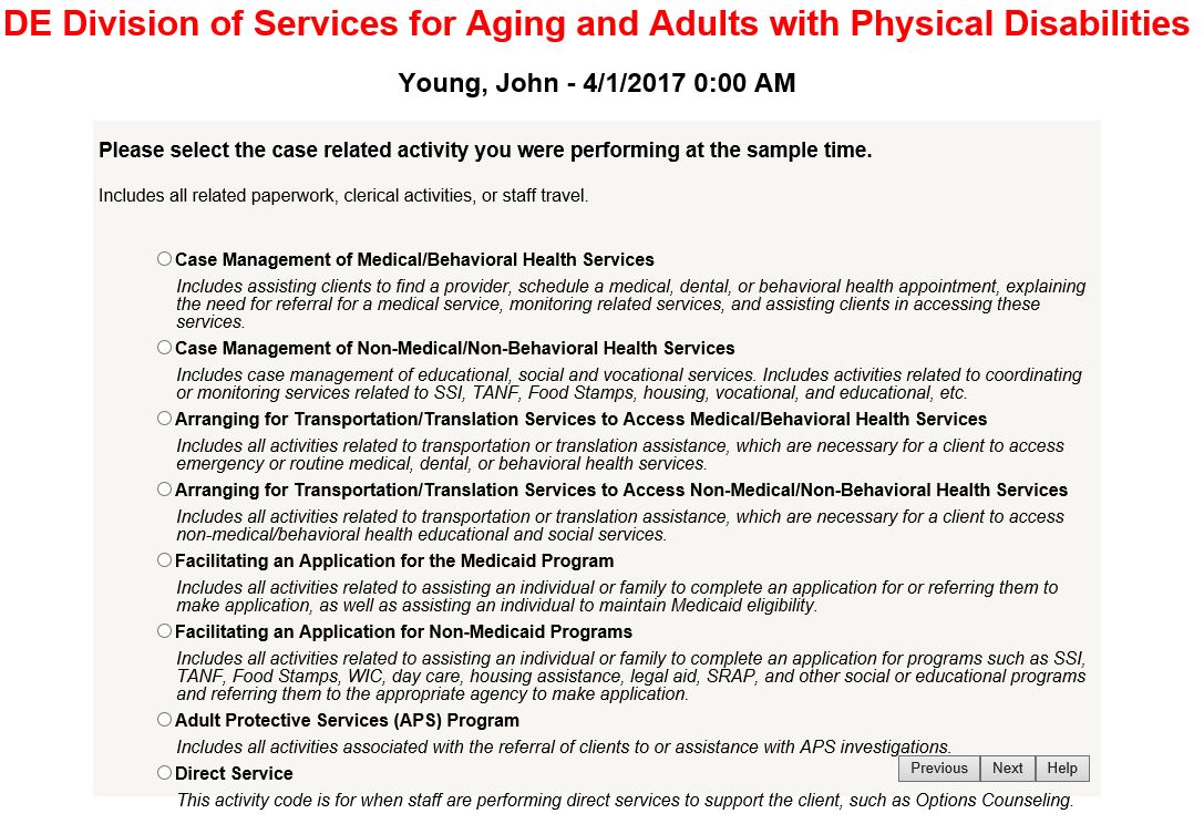 If you choose case related and enter a case number or program related training you will be taken to a screen where you will be asked a question to further assist you in selecting the activity you were participating in at the time of the moment. This is an example of the screen after selecting case related: